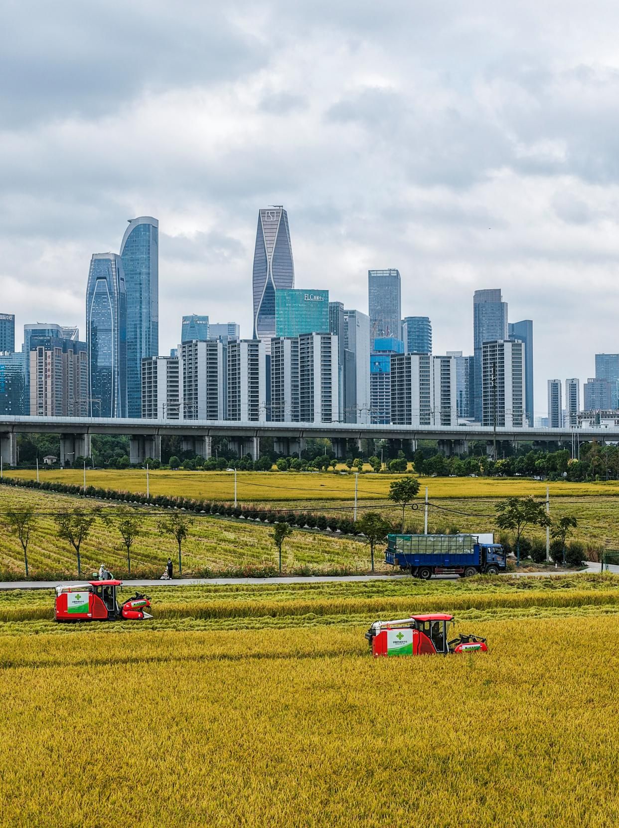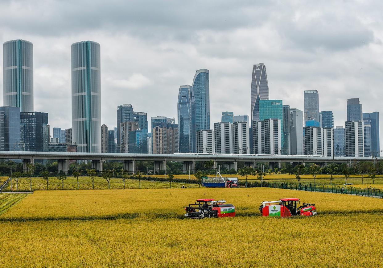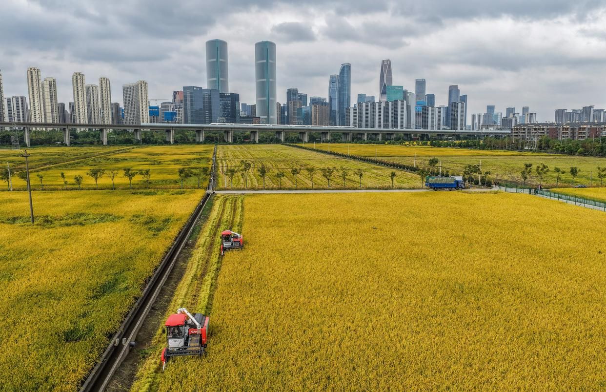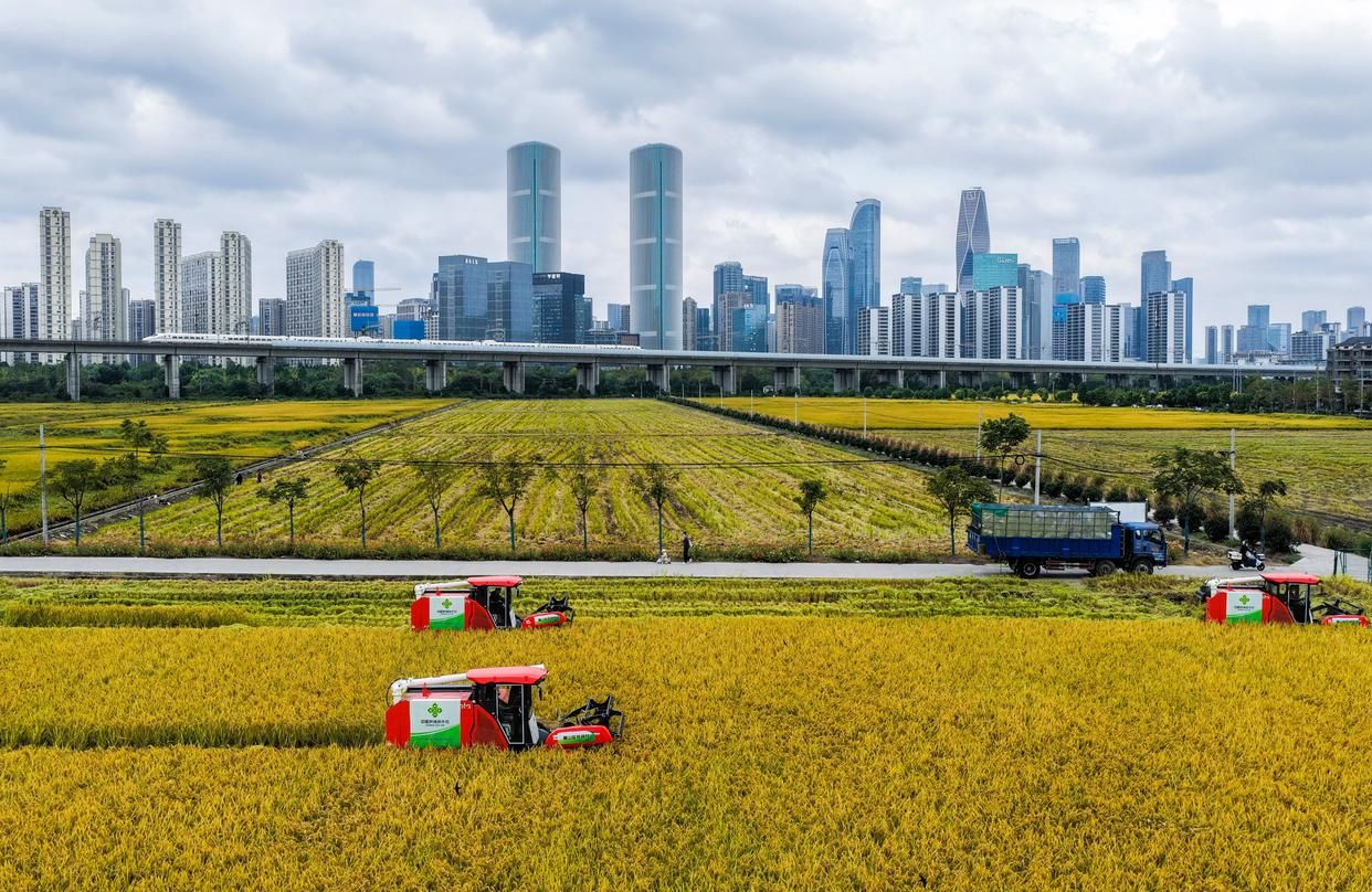 金秋时节,位于浙江杭州萧山区世纪田园粮食功能区的3000多亩水稻迎来丰收,金黄的稻田、飞驰而过的高铁列车和远处的城市天际线构成了独特的城市田园画卷。