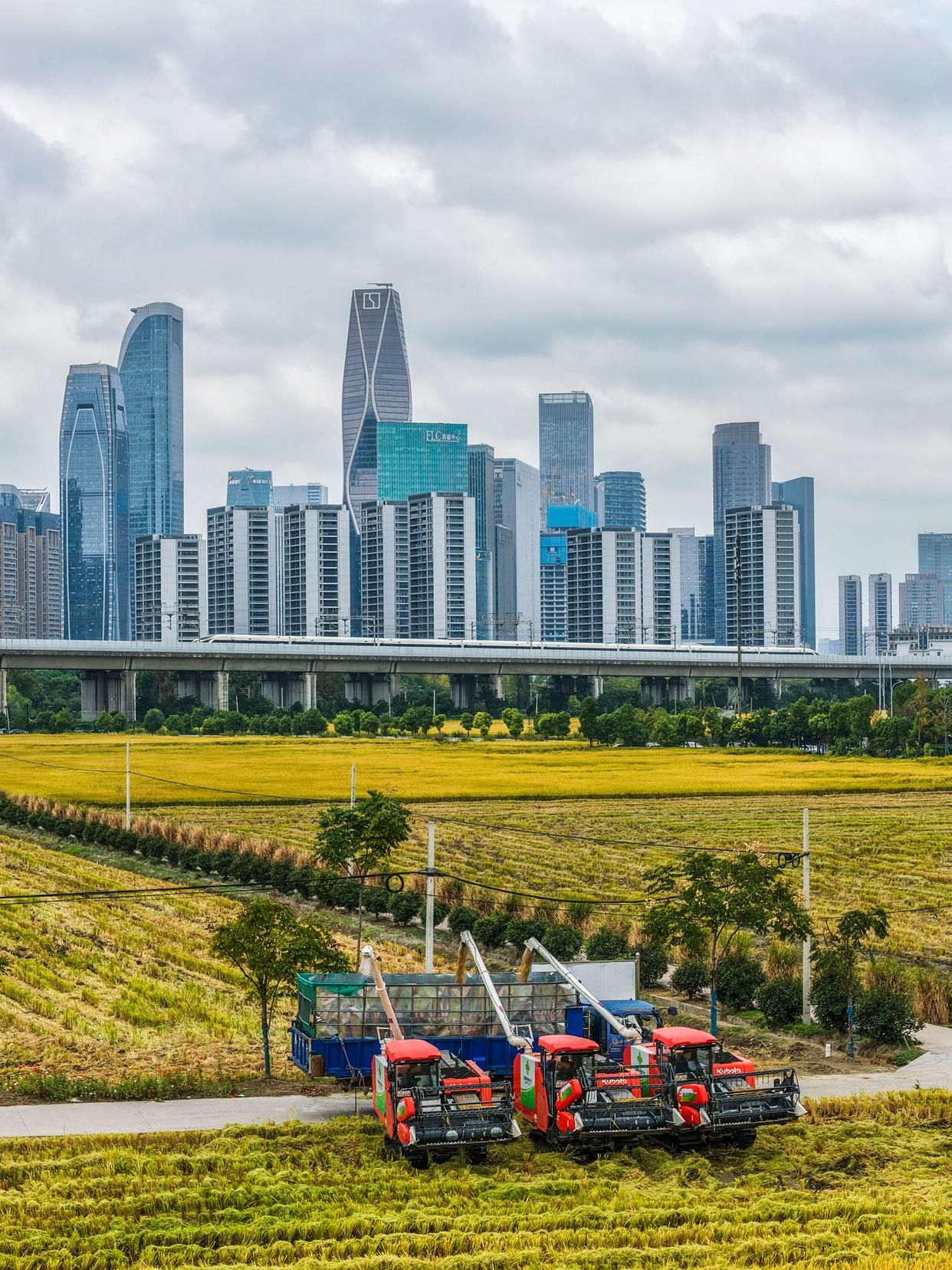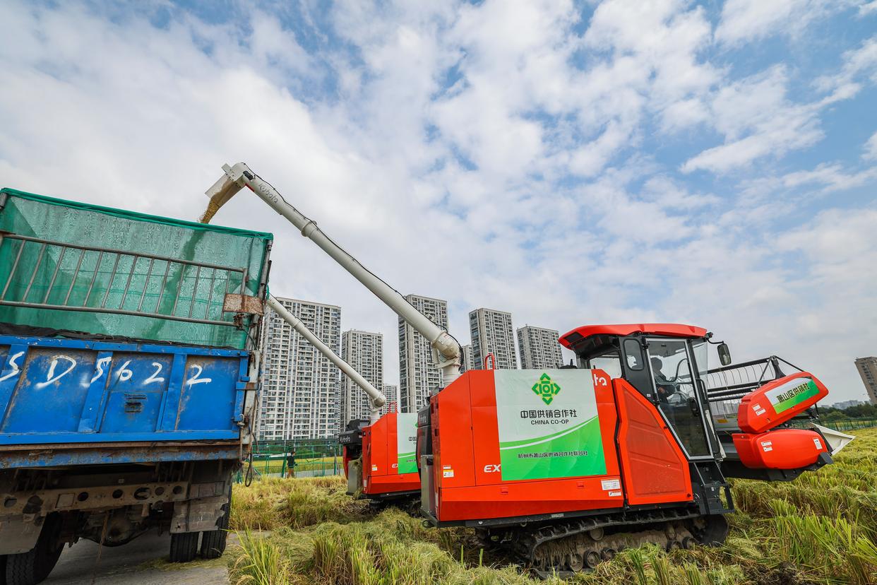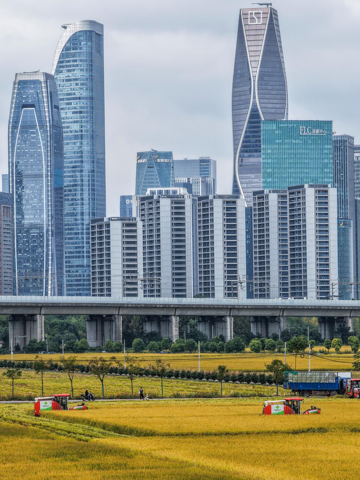 金秋时节,位于浙江杭州萧山区世纪田园粮食功能区的3000多亩水稻迎来丰收,金黄的稻田、飞驰而过的高铁列车和远处的城市天际线构成了独特的城市田园画卷。