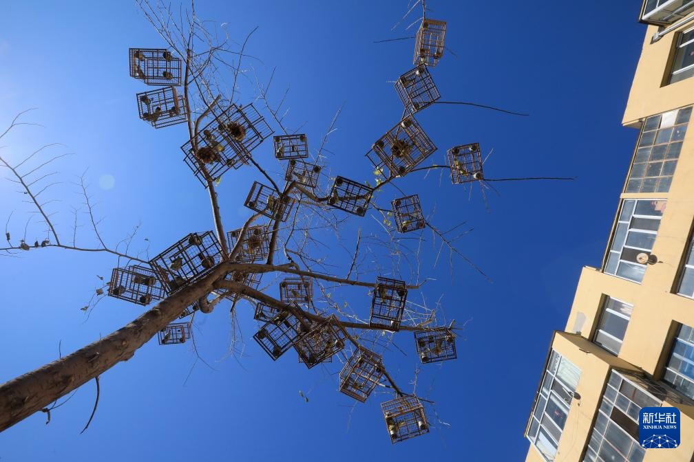 2025年10月19日,哈尔滨野保志愿者团队志愿者在野外摘下挂在树上的捕鸟滚笼及诱笼。新华社发(张树摄)