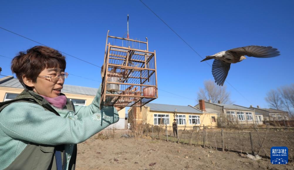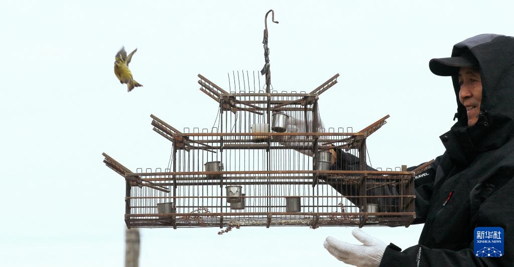 哈尔滨野保志愿者团队志愿者放飞被捕鸟笼捕获的鸟类(2023年11月4日摄)。新华社发(张树摄)