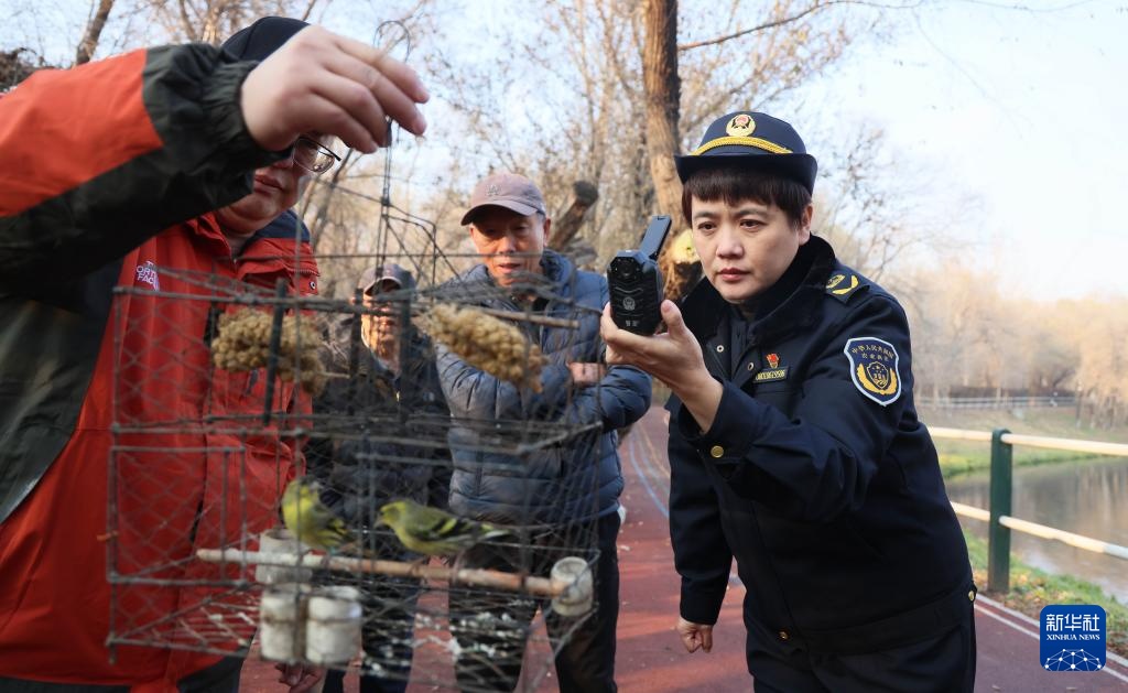 哈尔滨野保志愿者团队志愿者协助执法人员对非法捕猎的鸟类留证(2024年10月27日摄)。新华社发(张树摄)