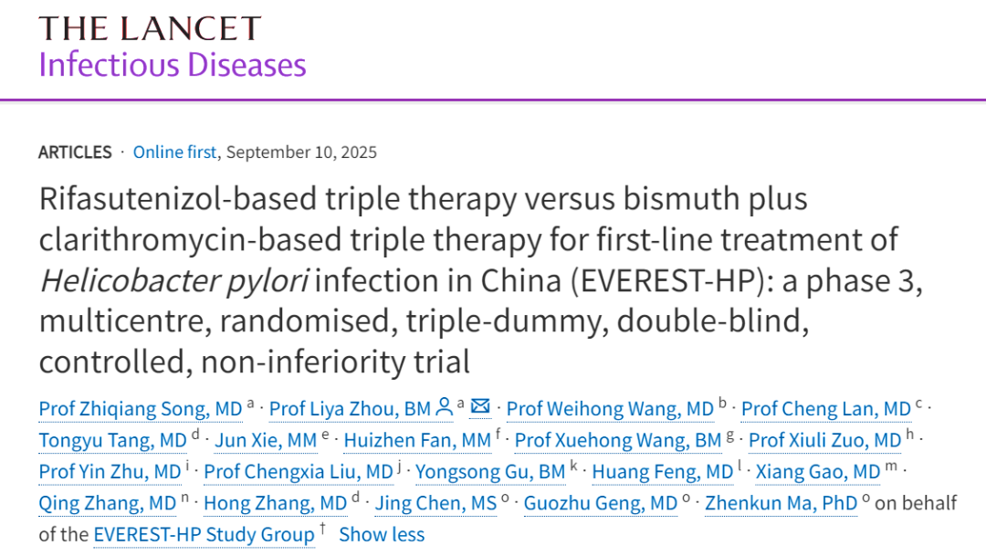 如今,这一严峻的公共卫生难题有了破解之钥:北京大学第三医院消化科周丽雅/宋志强教授团队带领全国40家医疗机构消化疾病诊疗中心研究发现,含利福特尼唑的三联方案,让幽门螺杆菌治疗有望重新回归更简便的三联方案时代,为全球幽门螺杆菌感染者带来了全新的治疗选择。相关成果日前于《柳叶刀-感染病学》在线发表。