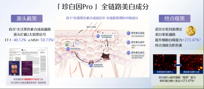 据了解,该成分创新性融合2016年诺贝尔奖“细胞自噬”理论,通过 “抑制致黑信号→阻断生成→抑制酪氨酸酶→阻断转运→加速代谢” 五重靶向路径,构建出全链路美白体系,也是首个实现黑色素前中后全链路管理的中国成分。