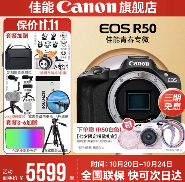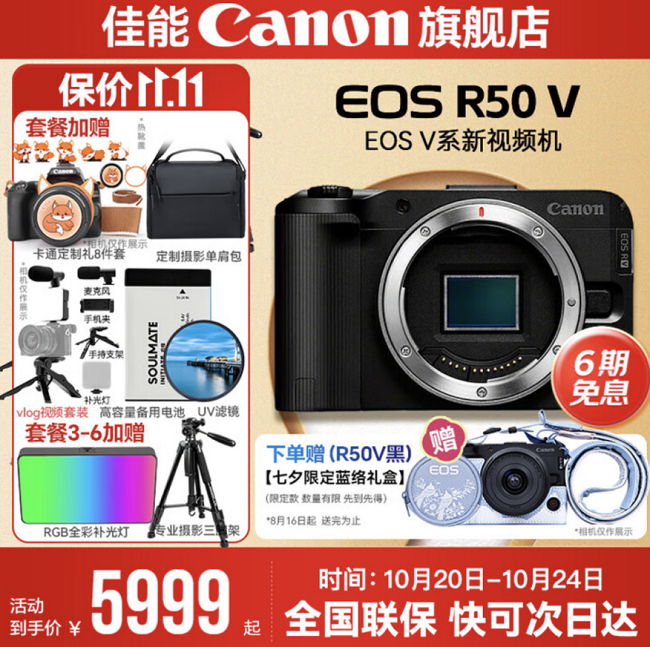此次双十一大促期间,佳能R50V以5999元起的惊喜价格重磅登场,并同步推出基础入门、旅游达人、进阶摄影、专业摄影、豪华摄影及vlog视频六大梯度套餐组合,以极具诚意的配件阵容充分展现其"全能视频创作伙伴"的产品定位。从入门到专业,每个套餐都经过精心搭配,让不同需求的用户都能找到最适合自己的选择。