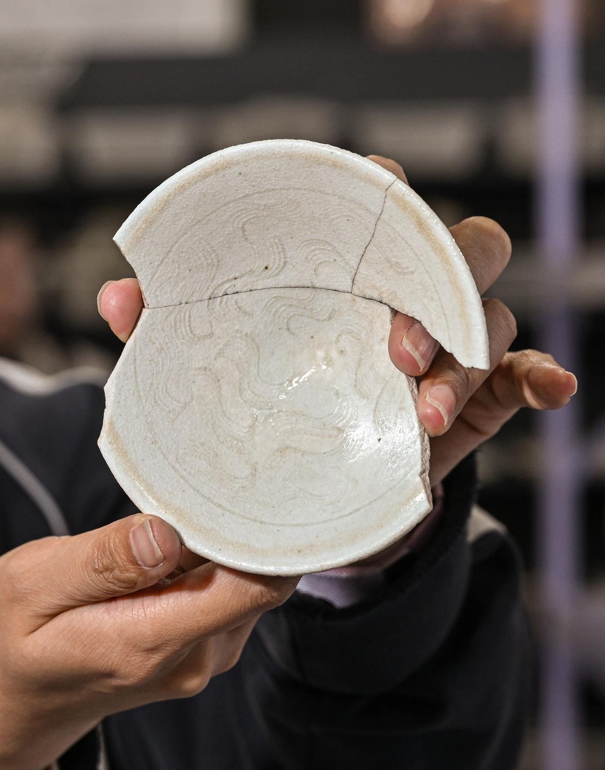 ↑ 工作人员在苏峪口瓷窑址考古队文物库房内展示发掘出土的带有刻划花纹的瓷器残片(10月13日摄)。新华社记者 李贺 摄