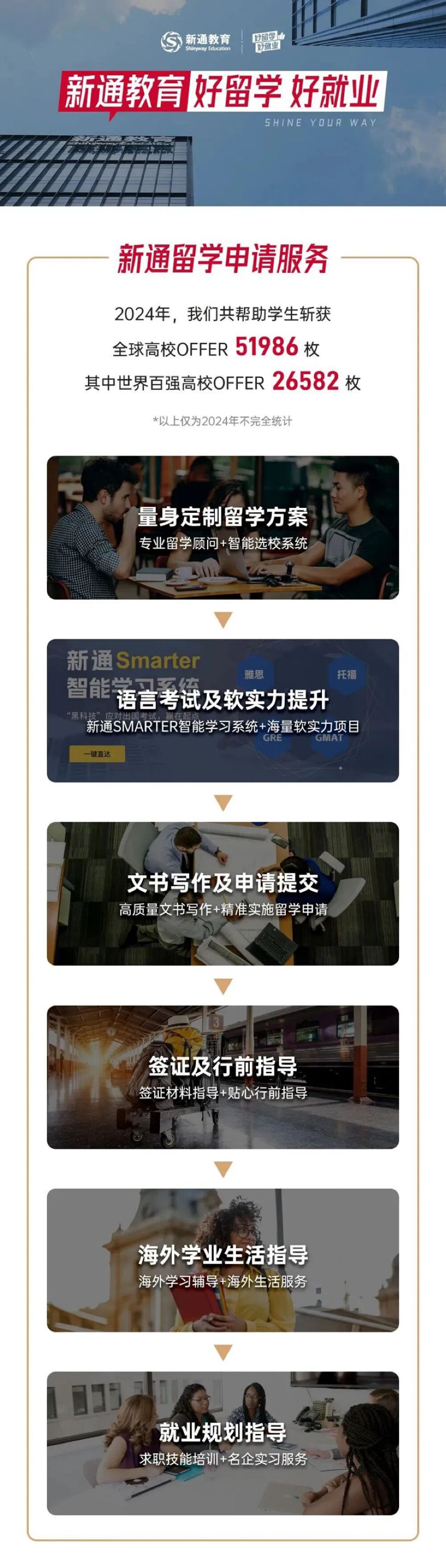 新通教育将充分发挥在国际教育行业的深厚积淀,构建更加完善的国际化教育服务体系。我们致力于为每一位学子,量身打造贯穿学业规划、院校申请、海外后续服务及留学规划与申请「一体化」成长解决方案,提供专业、系统、可信赖的留学规划与全方位服务支持,助力其成功走向世界舞台。