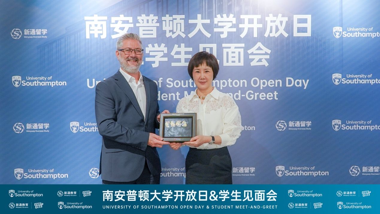 新通教育集团总裁麻亚炜女士与南安普顿大学国际招生与合作副总监 Mark O'Keeffe 进行了亲切交流,并代表集团向校方赠礼。在后续环节中,麻亚炜女士致辞欢迎,Mark O'Keeffe 也针对2026年的关键招生政策与课程动态进行了前瞻分析,为未来合作方向提供了重要参考。