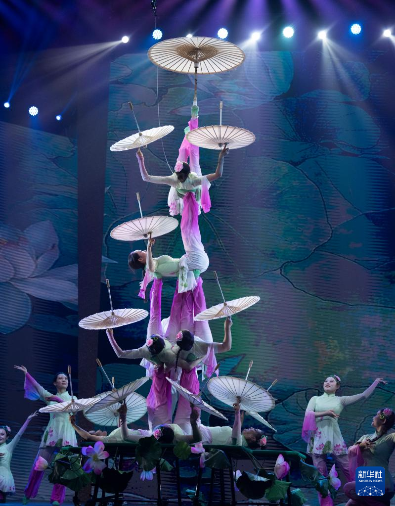 10月25日,在北京二七剧场举行的“艺苑撷英——2025年全国优秀青年艺术人才展演”上,德州市杂技团演员表演杂技《荷塘月色——蹬伞》。