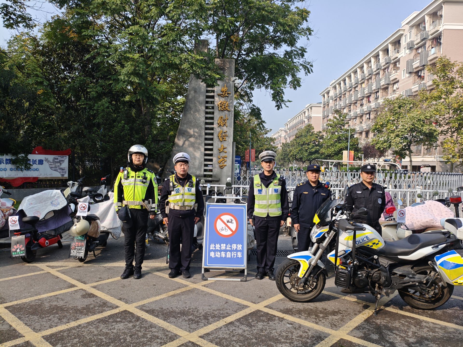 为啃下这块“硬骨头”,龙子湖交管大队主动牵头,联合辖区城管综合执法大队、安徽财经大学构建“协同共治”格局,明确要求学校落实“门前三包”主体责任,提前通过校园微信班级群、公告栏推送规范停放通知,并在东门、南门安装醒目的禁停标志与指引牌,通过“宣传引导+联合执法+长效管控”为整治行动筑牢基础,为专项整治行动筑牢宣传基础。