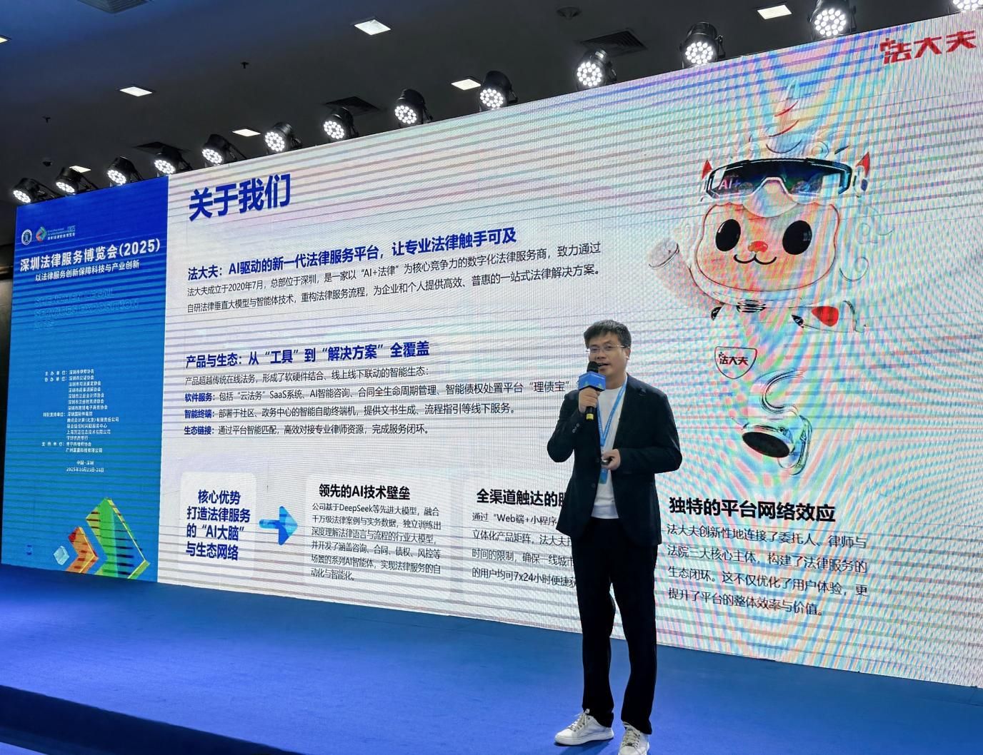 展会期间,法大夫创始人冷芬满在路演区开展了“AI重塑法律服务,让专业法律触手可及”主题分享,系统阐述了法大夫的技术路径与行业思考。他介绍,法大夫以DeepSeek为技术底座+自研法律垂类大模型,构建起“软件服务+智能终端+生态链接”的产品矩阵,已形成覆盖企业、个人、政府、律所、律师的全场景解决方案。