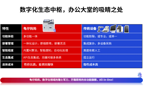 与传统设备复杂的集成和部署流程不同,龟仔妈妈采用All-in-One设计,即插即用,部署灵活。企业无需额外配置,即可快速上手,大大缩短了数字化转型的准备时间,降低了部署成本。