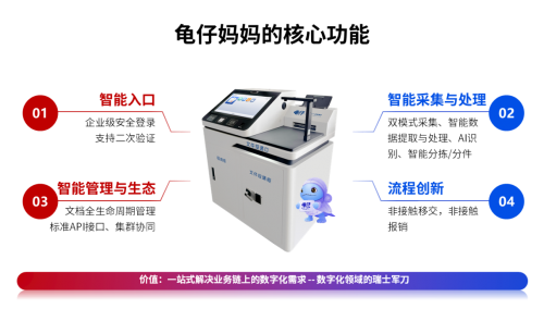 在数字化浪潮下,企业仍面临纸质文件堆积、人工处理低效、流程环节多易失控、数据孤岛难破等痛点。新档案法虽明确电子档案合法性,但实际管理中,纸质档案的数字化转化仍是“最后一公里”难题。龟仔妈妈正是针对这一需求而生——它是一台集“采集、识别、管理、集成”于一体的档案数字化智能工作站,专攻日常纸质文件处理,目标是将杂乱纸质文件一键转化为可直接融入业务系统的高质量数字化信息。