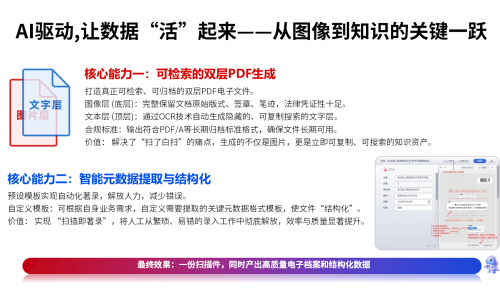 无论是普通文件,还是珍贵古籍,一机全能,无损处理。扫完即能用,自动完成OCR、文件分拣、数据提取和分类归档。让纸质档案秒变结构化数据,大幅提升了档案数字化的工作效率与准确性,减少了人工干预与错误。