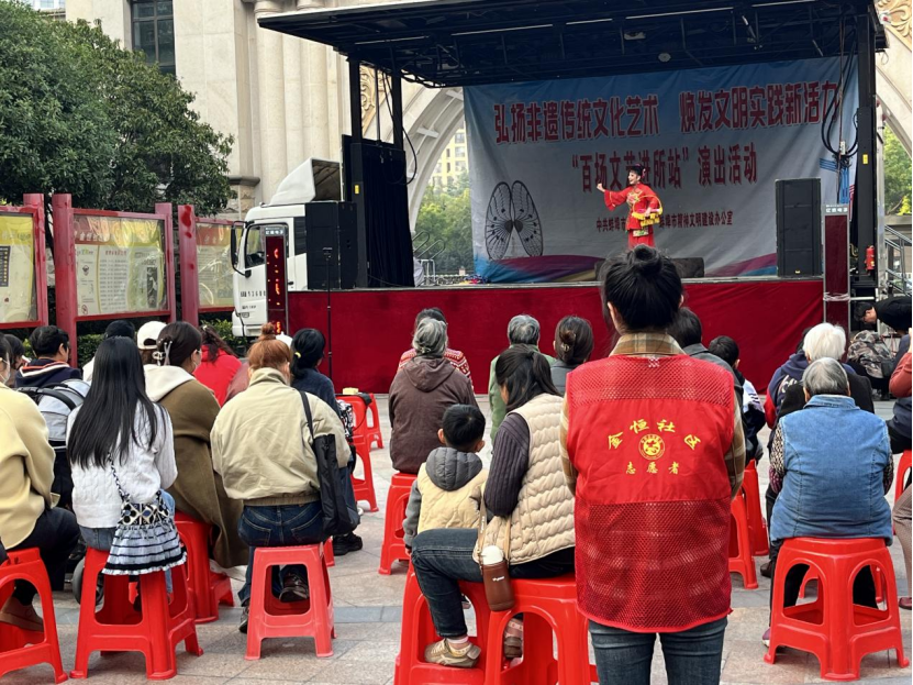 为进一步发挥新时代文明实践阵地作用,不断丰富群众文化生活,由中共蚌埠市委宣传部、市精神文明建设办公室精心策划的“百场文艺进所站”演出活动,于10月27日走进金恒社区新时代文明实践站,为居民朋友带来“泗州戏”等精彩的文艺演出。(邓婷婷) 0