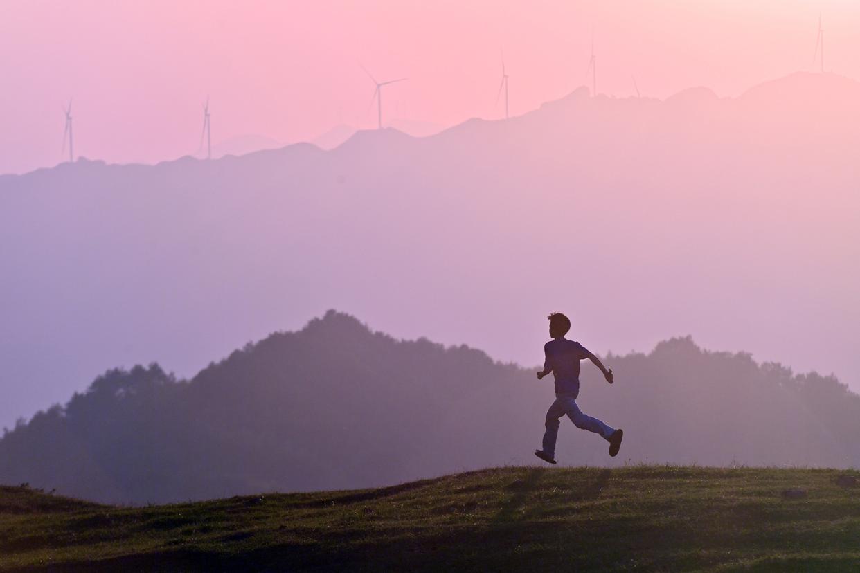 在广西融水苗族自治县杆洞乡尧告村高山牧场,一名少年在夕阳下奔跑(2024年8月14日摄)。新华社记者 黄孝邦 摄