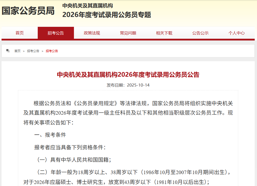 根据10月14日发布的2026年度国考公告,报考者的年龄上限提高到38岁,应届硕士、博士研究生放宽到43周岁以下。