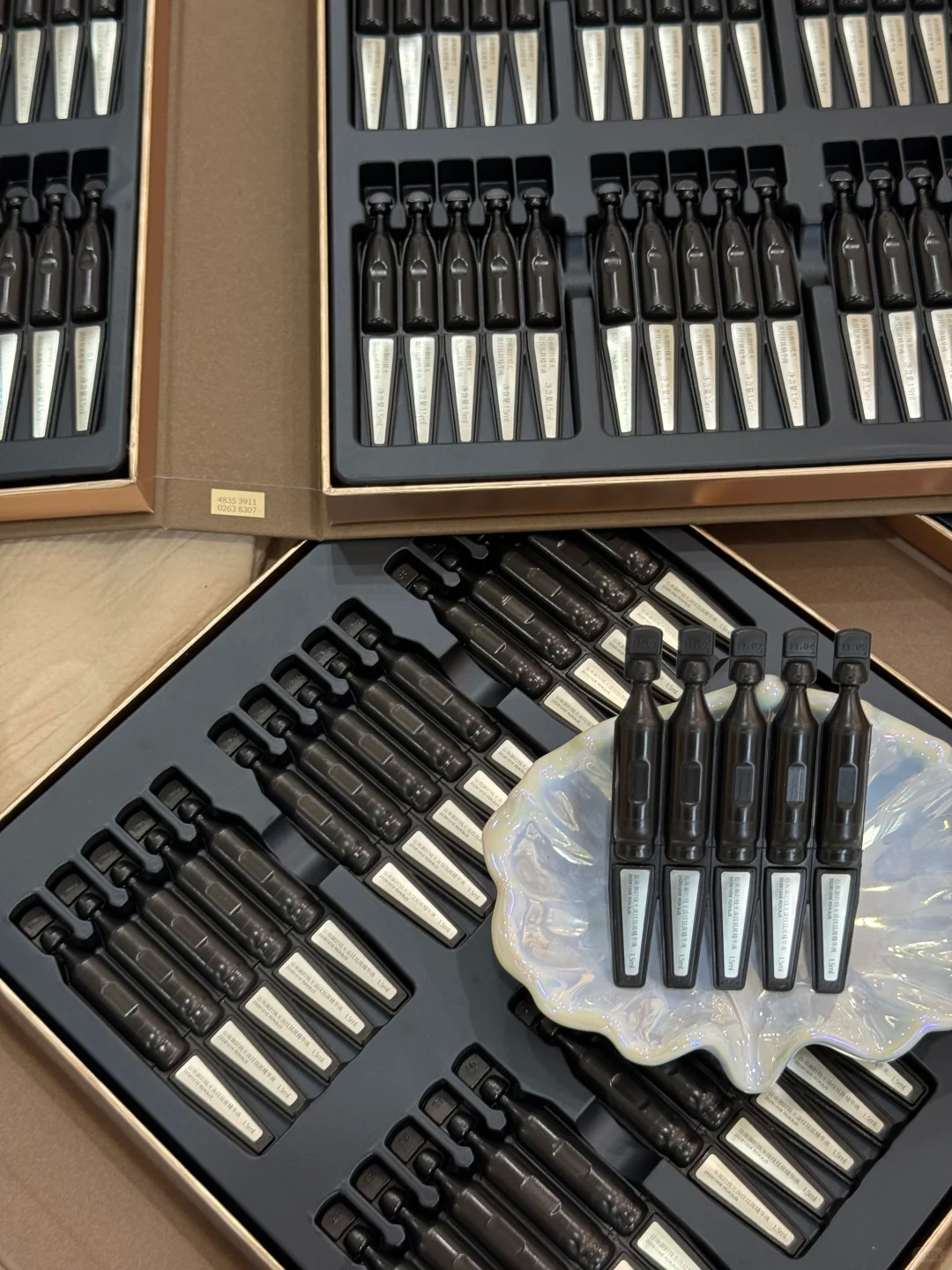 这款贵妇线抗老产品不愧是 “防御塔” 级存在,光看钻石切割瓶身就透着底气 —— 光线折射时像藏了一捧碎钻,摆在梳妆台上都像件艺术品,拿起时沉甸甸的质感,仿佛握着一整瓶抗老能量。