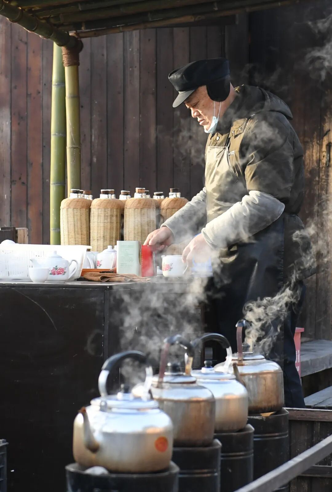 一名摊主在乌镇一边煮茶一边给客人制作早餐。新华社记者 翁忻旸 摄