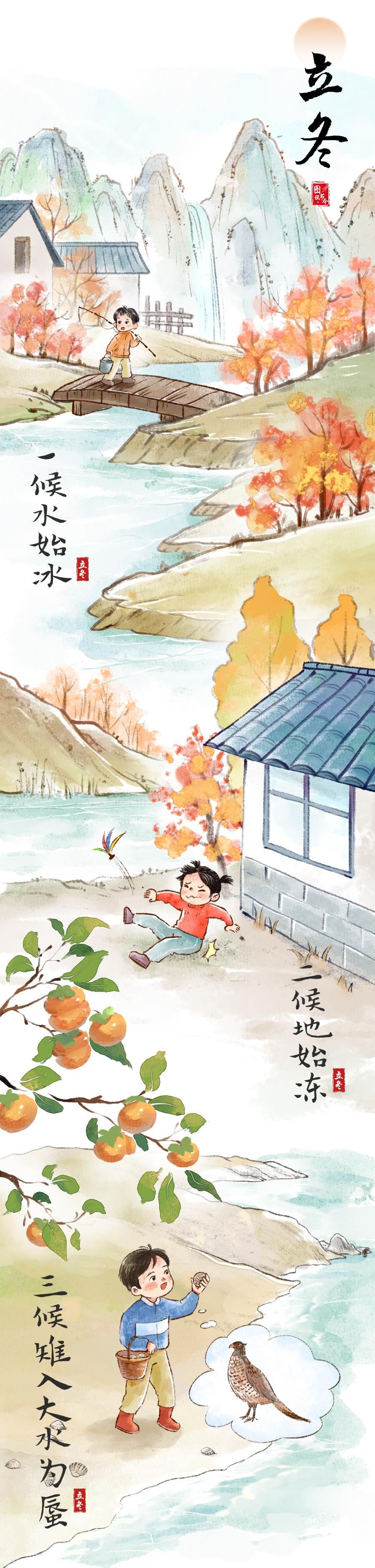 图说节令·立冬丨三候之美 11月7日,以“立冬”为起始的冬季如约而至。春耕夏耘、秋收冬藏,冬季是享受丰收、休养生息的季节,祭祖、饮宴、迎冬等传统民俗饱含了对一年辛劳的犒赏。 古人将立冬分为三候:一候水始冰,二候地始冻,三候雉入大水为蜃。新华社发 王斌 作 0