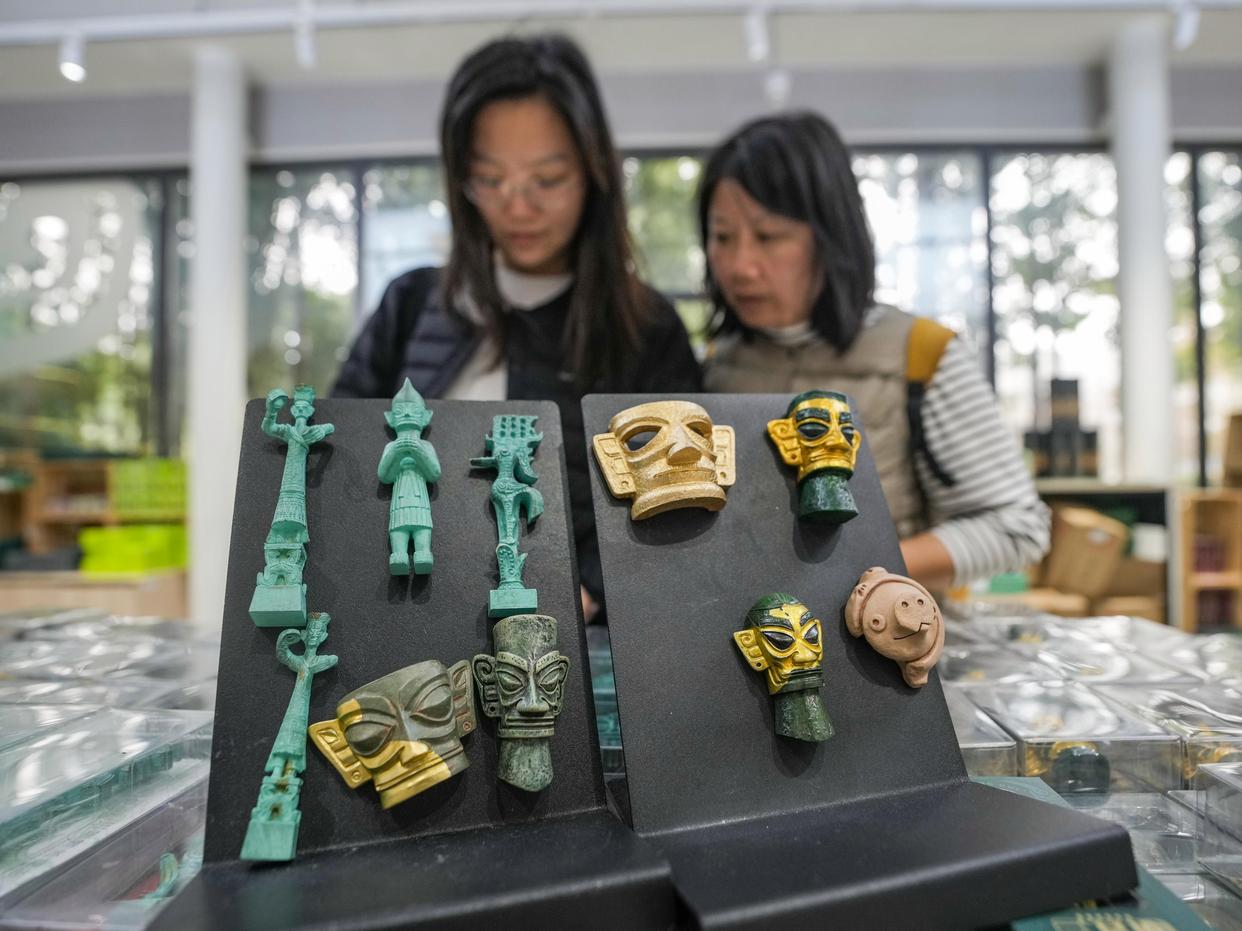 近年来,三星堆遗址重要考古发现成果陆续公布并展出,带动三星堆博物馆的文创产品设计销售热潮。一些文创产品取材于发掘出土的金面罩、青铜器等文物,受到人们的欢迎。