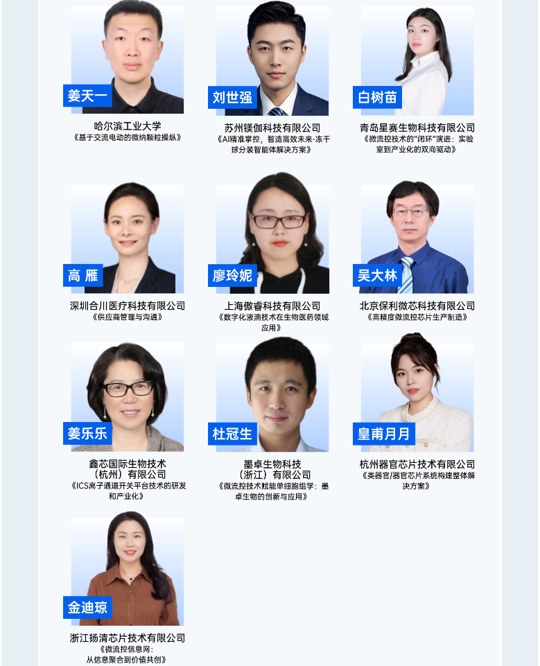 参展&赞助企业:宁波海尔施基因科技股份有限公司、青岛星赛生物科技有限公司、苏州镁伽科技有限公司、北京保利微芯科技有限公司、深圳市合川医疗股份有限公司、杭州霆科生物科技有限公司、浙江扬清芯片技术有限公司、鑫芯国际生物技术(杭州)有限公司、杭州器官芯片技术有限公司、北京宏芯未来科技有限公司、上海傲睿科技有限公司、海宁市高新技术研究院、西安励德微系统科技有限公司、上海普利生三维科技有限公司、美国科洛玛技术公司、必有路系统科技(苏州)有限公司、埃微泰(广州)光电科技有限公司、深圳市深视智能科技有限公司、礼德(上海)生物科技有限责任公司、大连拓微芯片科技有限公司、微纳立方科技(北京)有限公司、北京中瑞天达科技有限公司、北京三满科技有限公司、深圳垦拓流体技术股份有限公司、顶旭(苏州)微控技术有限公司、深圳市京赤科技有限公司、广州点成生物科技有限公司、广州万众激光科技有限公司、宁波智造数字科技有限公司、南京吉奥乐吉科技有限公司(排列不分先后顺序)