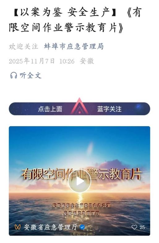 “有限空间,无限风险”——近期有限空间作业安全事故频发,部分事故因违规操作、盲目施救导致伤亡扩大,一幕幕惨痛教训为安全生产工作敲响了振聋发聩的警钟。为切实筑牢安全生产防线,压实企业主体责任,有效防范化解风险,蚌埠市应急管理局迅速部署,一场覆盖全市重点行业、重点企业的“无死角”有限空间作业安全专题警示宣传教育行动全面展开。全市各相关企业积极响应、主动作为,将自主开展的应急演练、警示片观看等活动深度融入宣传教育体系,形成了“政企同心、上下联动”的良好氛围,让安全理念真正扎根一线、深入人心。