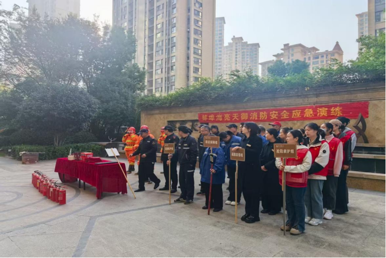 2025年11月是第34个全国消防宣传月,为认真开展好“119”消防宣传月活动,切实提高消防安全意识和技能,增强火灾事故应急处置能力,落实消防安全责任,筑牢消防安全防线。11月5日,蚌山区湖滨社区中心天御华府社区组织物业在海亮天御C区小区开展了消防演练。