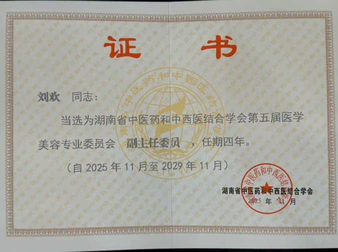 值得关注的是,凭借在医学美容领域的卓越贡献和专业技术,刘欢院长在本次大会上当选为湖南省中医药和中西医结合学会第五届医学美容专业委员会副主任委员。这一荣誉不仅是对其个人专业能力的肯定,更是对长沙美莱学术地位的认可。