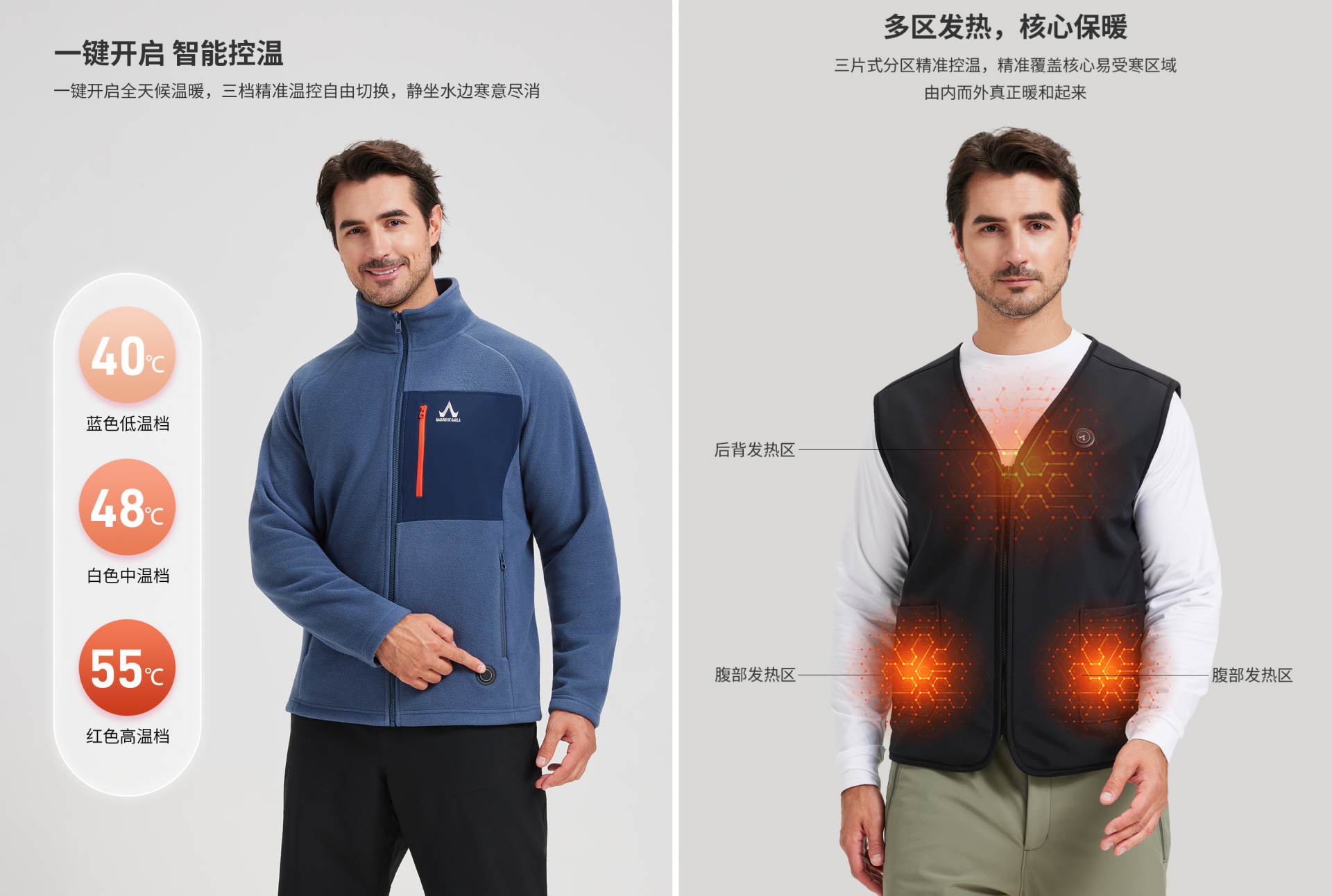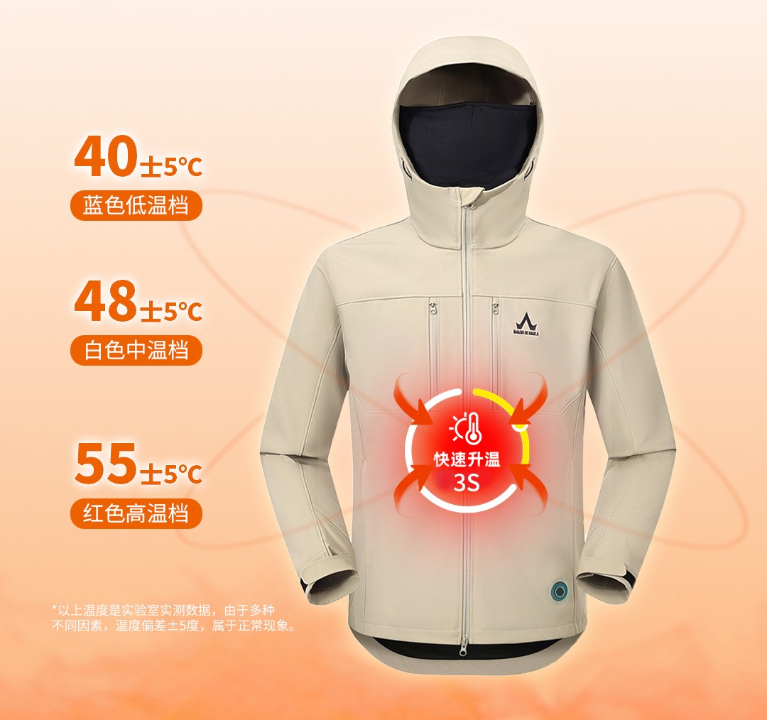 同时,备受关注的男款智能加热软壳衣,则突破行业技术瓶颈,内置隐藏式发热系统,其智能温控模块可实现3-8小时持续供热,更实现“全衣无忧机洗”,解决了智能服装清洗难的行业通病。此外,加热抓绒衣、加热马甲等单品组成的组合套组,还构建起“全天候防护体系”,即便突降恶劣天气也能从容应对。