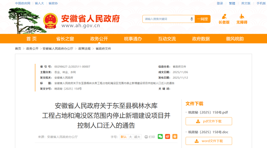 11月12日,安徽省人民政府网站发布安徽省人民政府关于东至县枫林水库工程占地和淹没区范围内停止新增建设项目并控制人口迁入的通告。