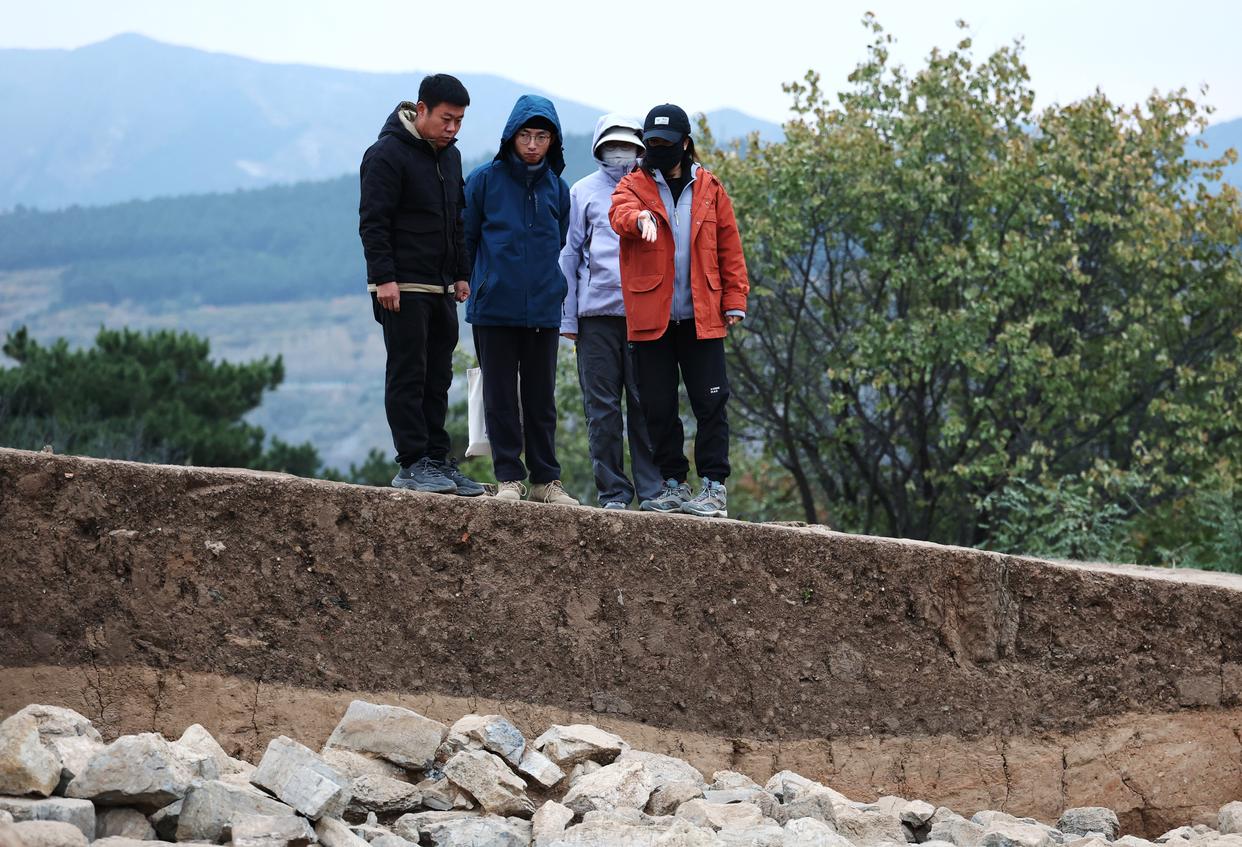 10月24日,于怀石(右二)和同事在位于辽宁朝阳的牛河梁遗址第十三地点工作。新华社记者 李钢 摄