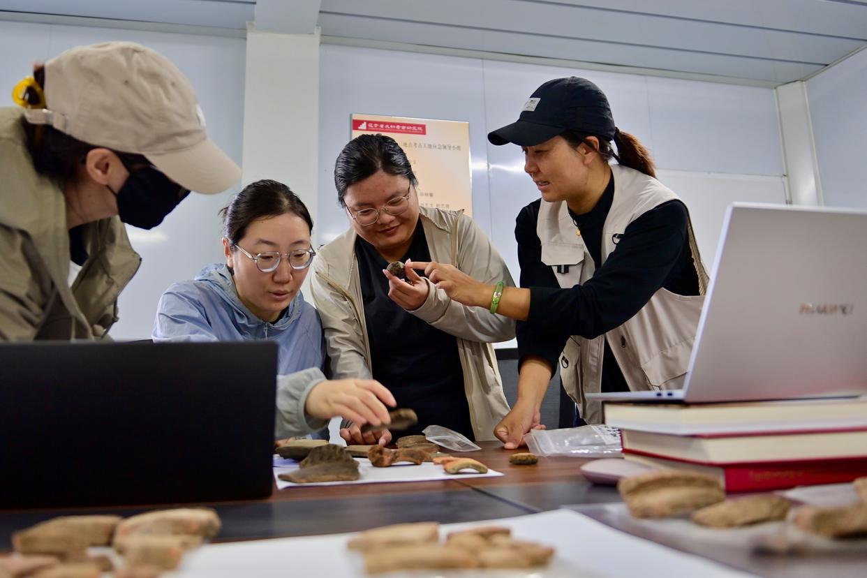 9月28日,于怀石(右一)和同事在位于辽宁朝阳的牛河梁工作站内辨别出土的文物。新华社记者 吴青昊 摄