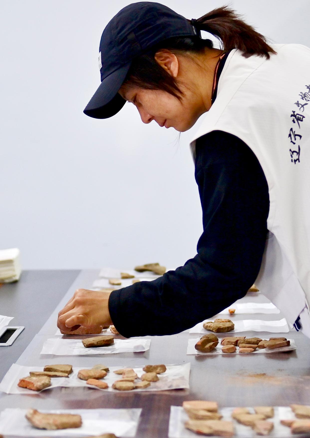 9月28日,于怀石在位于辽宁朝阳的牛河梁工作站内对陶片进行分类。新华社记者 吴青昊 摄