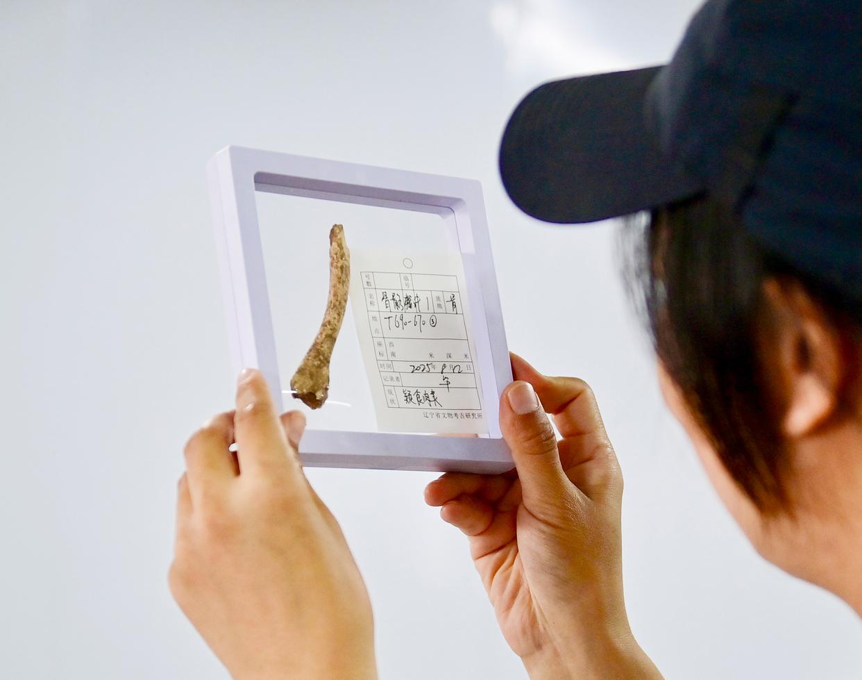 9月28日,于怀石在位于辽宁朝阳的牛河梁工作站内查看骨骸残件。新华社记者 吴青昊 摄