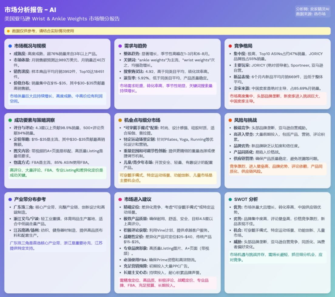 在展会现场,卖家精灵将展示其AI功能矩阵,覆盖市场洞察、竞品分析、评论分析、Listing生成、专利检测等核心运营场景。比如AI-市场洞察,卖家仅需一分钟即可生成涵盖市场规模、需求趋势、竞争格局等多个维度的洞察报告,帮助快速把握市场动态,发现差异化机会,并优化选品和营销策略。欢迎莅临D1馆F39展位亲自体验,让智能工具成为跨境出海的新助力。
