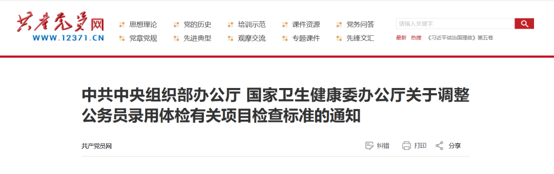 共产党员网日前发布《中共中央组织部办公厅 国家卫生健康委办公厅关于调整公务员录用体检有关项目检查标准的通知》,原文如下: