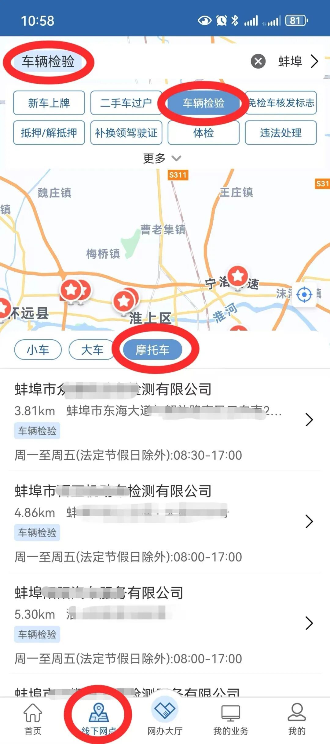 网友您好,推荐您使用“交管12123”手机APP中“线下网点”功能,您可根据需要选择机动车检测点。(具体操作功能附下图)