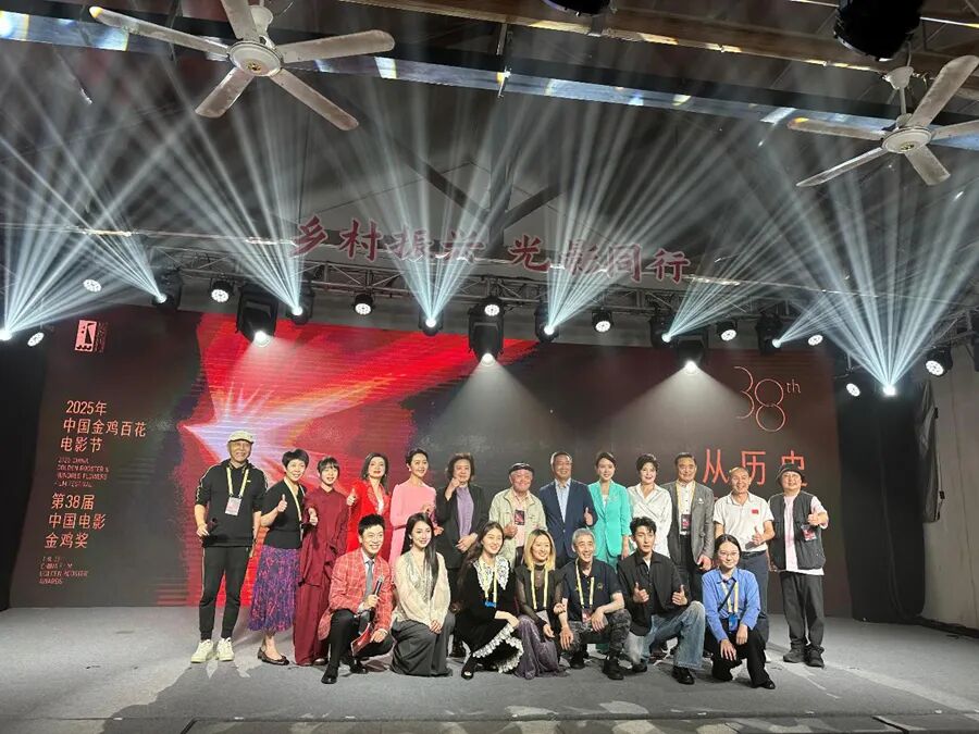 11月13日,2025年中国金鸡百花电影节电影工作者走基层惠民活动在厦门海沧区东孚街道举行。这是演出结束后的合影留念环节。新华网 薛莹莹 摄