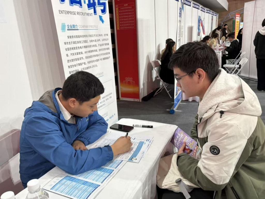 招聘现场,蚌埠企业展位前始终人流不断。学子们围绕岗位技术要求、职业发展路径及蚌埠人才政策主动提问。材料专业的王同学聚焦国钛纳米“研发岗位晋升体系”与人事展开交流,企业详细介绍了蚌埠人才引进相关扶持政策。据统计,当天累计接待咨询近200余人。