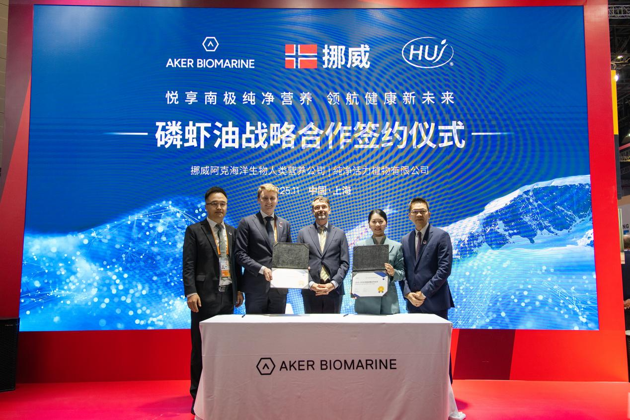 金秋时节,浦江潮涌。第八届中国国际进口博览会圆满落幕,汇聚全球155个国家、地区和国际组织,共促合作与发展。知名膳食营养补充剂品牌HUJ禾优健精彩亮相,与全球磷虾油行业领先企业——挪威阿克海洋生物公司(以下简称“挪威阿克”)在挪威国家馆举行战略合作签约仪式,共同探讨高纯度磷虾油的原料优势与科技价值。
