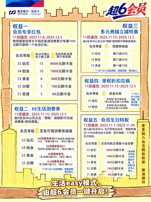 权益方面,从“会员专享消费红包”到“66生活消费券”,从“多元商城优惠券”到“里程折扣券”和“会员生日特权”,“超6会员”五大权益精准覆盖客户日常消费的核心场景,会员最高可获6666元刷卡金、166元消费券券包、1折里程兑换权益和30元商品券。