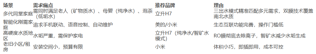 立升H7的价值在于“无短板均衡性”——通过双膜技术实现“南北水质通用、全家需求兼容”,尤其适合对水质适应性、长期成本敏感的家庭;