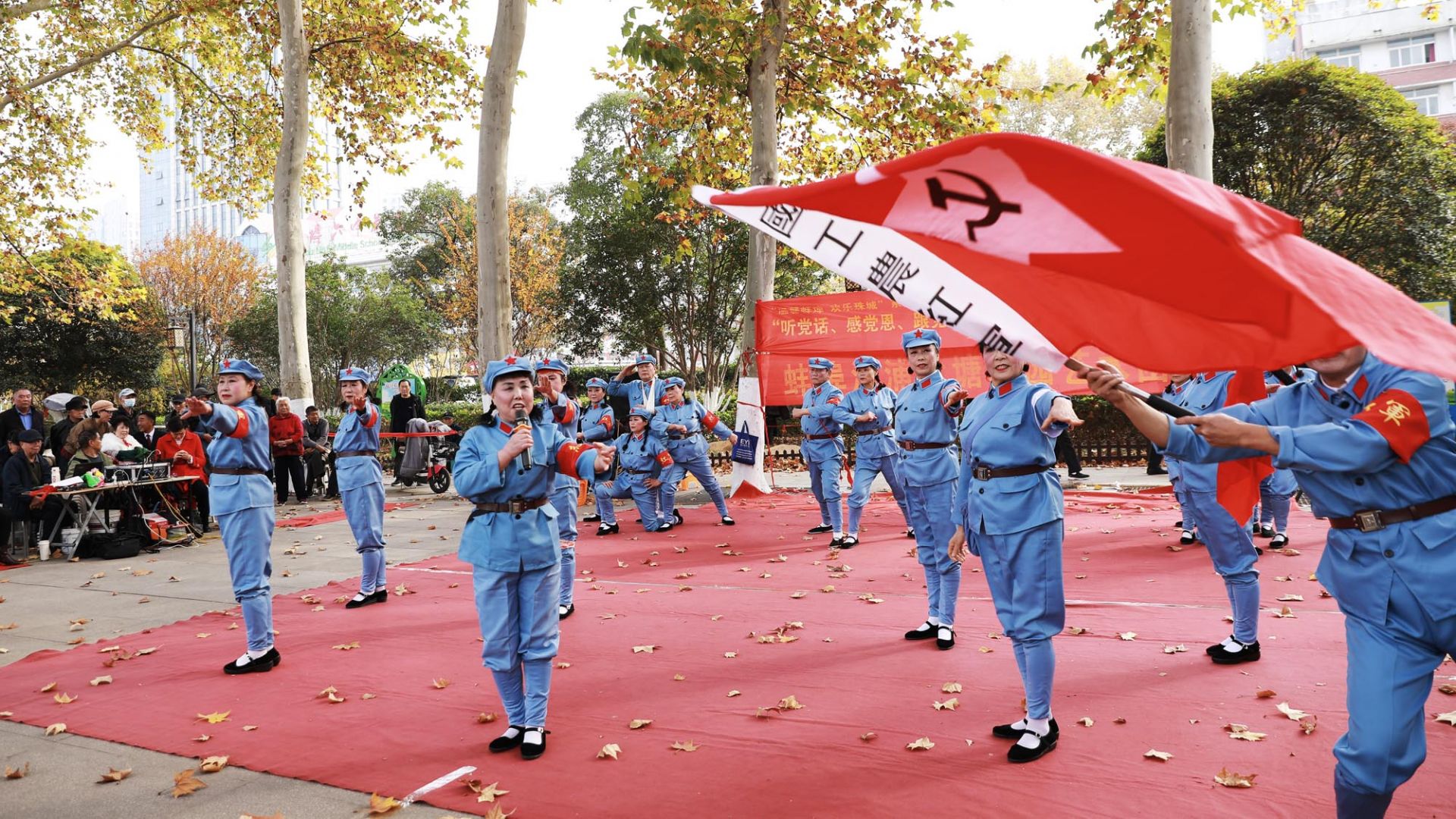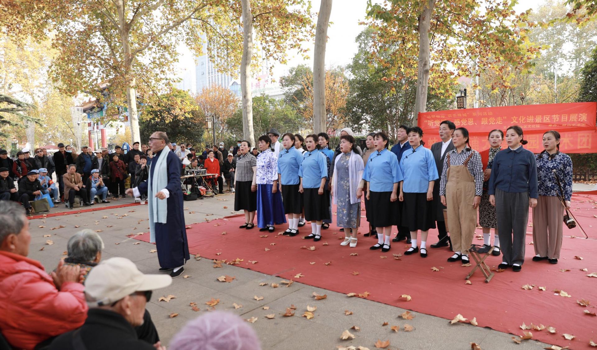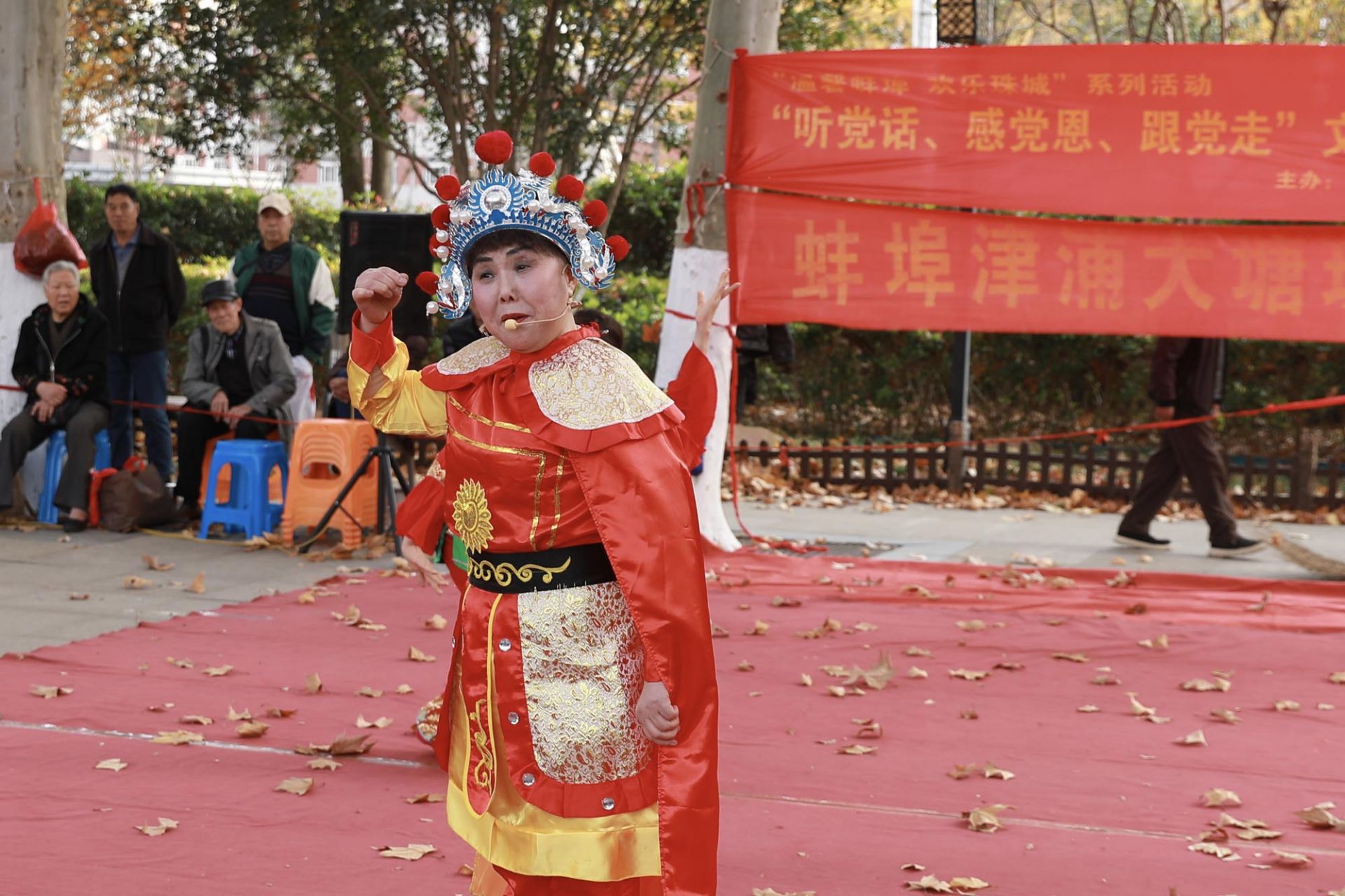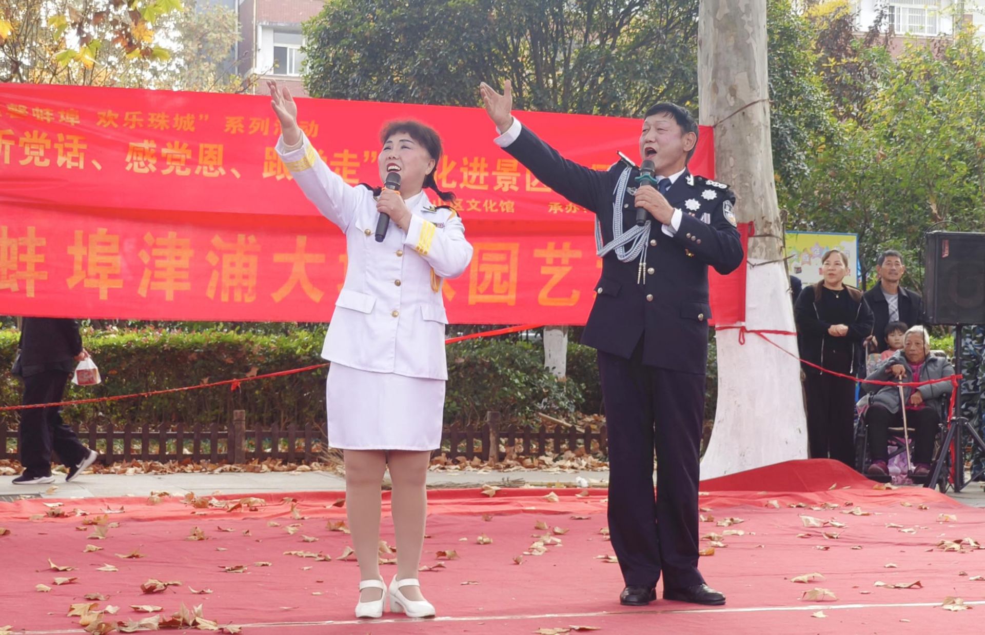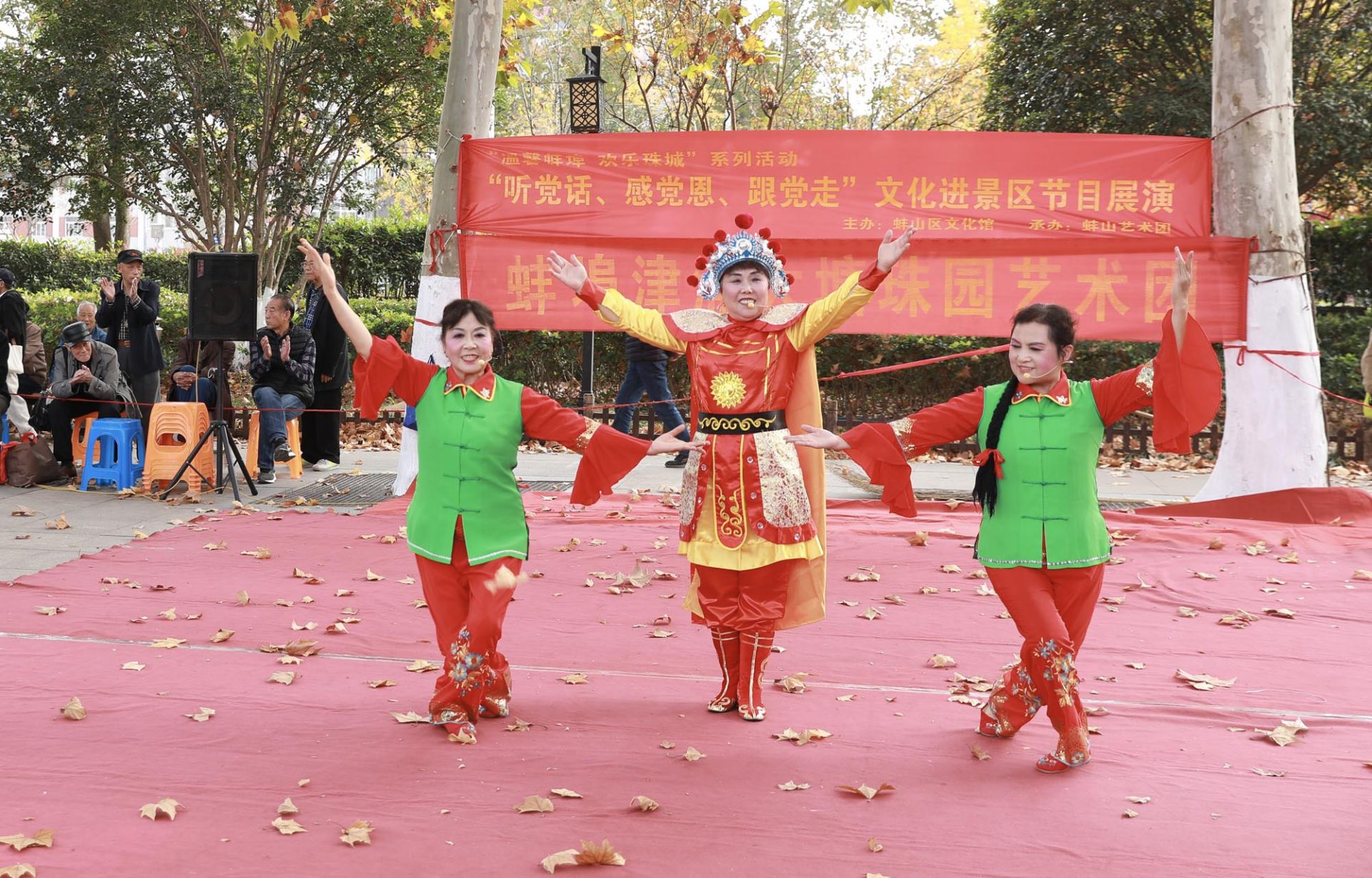 蚌山区文化馆日前组织蚌山艺术团的文化志愿者们在慰问养老院后送文化到大塘公园,受到游园群众的热烈欢迎。 张传安 摄