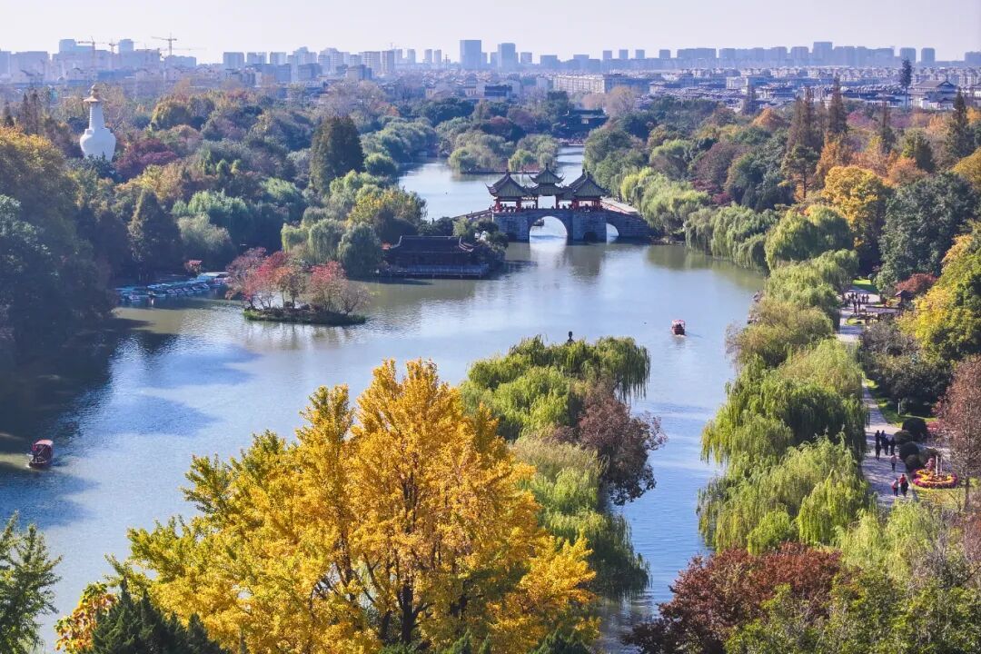 11月19日拍摄的江苏扬州瘦西湖风景区(无人机照片)。初冬时节,神州大地悄然开启了如诗如画的“美颜”模式。新华社发(齐立广摄)