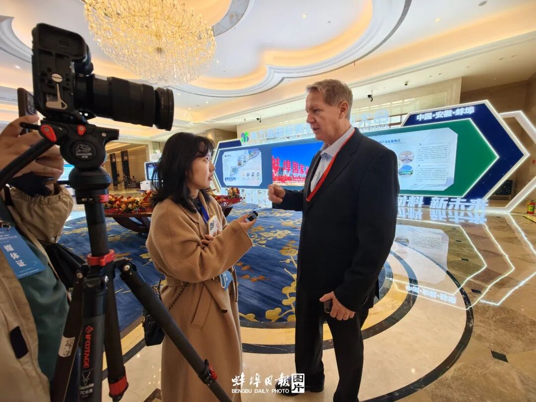 开幕式会场外,一位外国嘉宾接受采访。