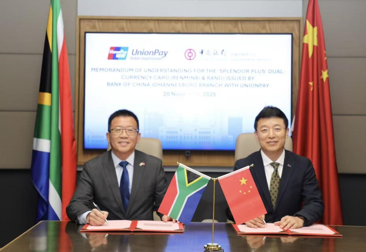 11月20日,银联国际与中国银行约翰内斯堡分行联合宣布,将在南非首次推出银联锦绣中华卡,这也是银联与中行携手在境外第11个国家和地区发行该系列卡片。在中国南非两国央行行长见证下,中国银联董事长兼银联国际董事长董俊峰与中国银行约翰内斯堡分行行长张朝阳签署合作备忘录。