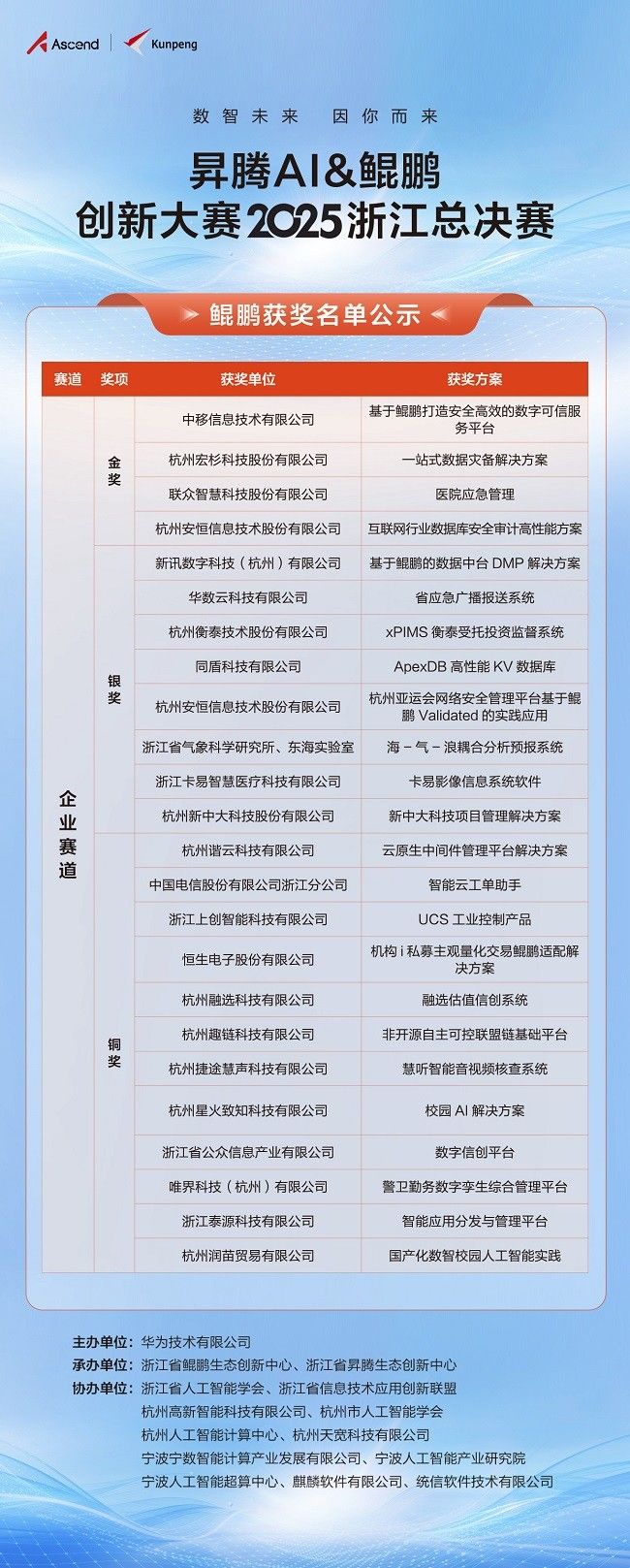 11月20日,昇腾AI&鲲鹏创新大赛2025浙江总决赛暨颁奖典礼在杭州隆重召开。本次大会以“数智未来 · 因你而来”为主题,由华为技术有限公司主办,浙江省鲲鹏生态创新中心、浙江省昇腾生态创新中心承办,浙江省人工智能学会、浙江省信息技术应用创新联盟、杭州高新智能科技有限公司、杭州市人工智能学会、杭州人工智能计算中心、杭州天宽科技有限公司、宁波宁数智能计算产业发展有限公司、宁波人工智能产业研究院、宁波人工智能超算中心、麒麟软件有限公司、统信软件技术有限公司联合协办,共同探索原生开发产品及解决方案,共建浙江繁荣的鲲鹏、昇腾产业生态。