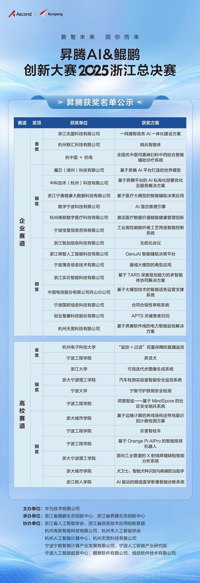 数智浪潮奔涌向前,创新生态聚力成势。昇腾AI&鲲鹏创新大赛2025浙江总决赛的成功举办,彰显浙江政、产、学、研、用多方协同推进自主创新的蓬勃活力。从高校人才培育到行业应用落地,从技术平台共建到赛事成果转化,每一份因你而来的参与,都在为智能世界注入新动能。