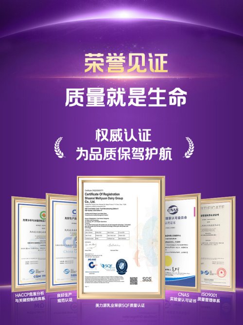 严格的质量管控为美力源赢得了诸多荣誉,美力源乳业已连续七年荣获“中国乳制品工业协会质量金奖”,连续三年荣获“世界食品品质评鉴大会”金奖,同时“连续四年荣获SQF认证”等奖项。