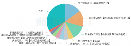 在2025年上半年中国零售药店终端维生素类(化药)TOP10品牌中,青岛双鲸药业的维生素D滴剂、国药控股星鲨制药(厦门)的维生素D滴剂、山东达因海洋生物制药的维生素AD滴剂依次位列前三,市场份额均超过10%。从销售增速看,赫力昂(苏州)制药的多维元素片(29-Ⅱ)、杭州民生健康药业的多维元素片(21)、山东达因海洋生物制药的维生素D滴剂同比增长均达两位数。